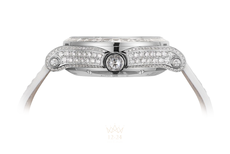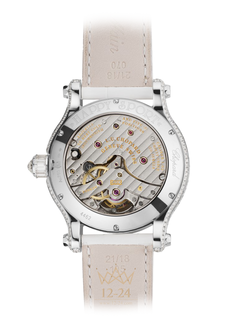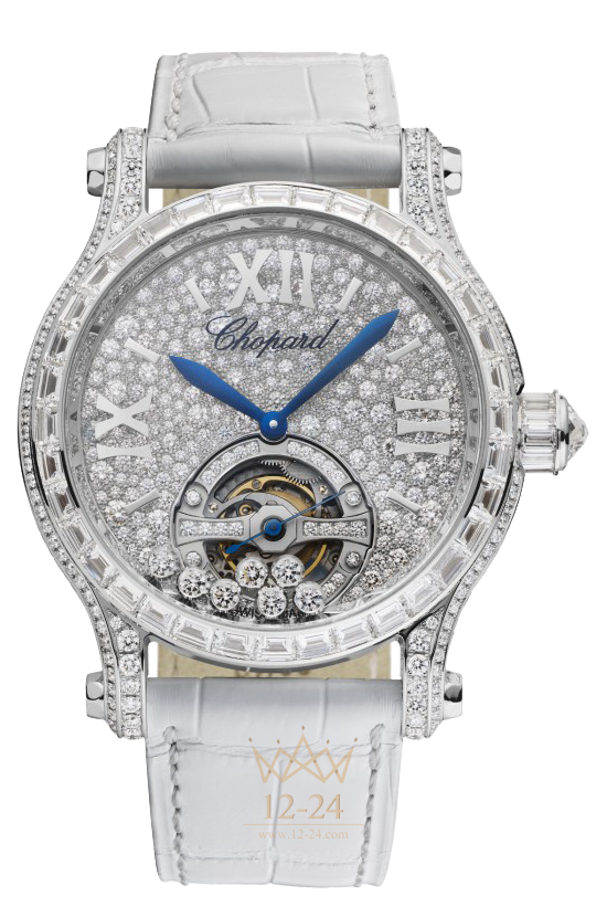 Эта модель Happy Sport представляет собой идеальное сочетание спортивных линий и элегантного дизайна. Изготовленные из белого золота 750 пробы и сверкающих бриллиантов часы оснащены калибром с ручным заводом L.U.C 02.16-L с турбийоном и украшенным бриллиантами мостом. Механизм удостоен сертификата хронографа COSC и престижного клейма качества «Poinçon de Genève». Завершенность облику модели придают легендарные подвижные бриллианты Chopard, исполняющие на усыпанном бриллиантами циферблате веселый и искрящийся светом танец.