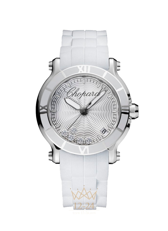 Часы Happy Sport 36 мм в корпусе из нержавеющей стали – это уникальное сочетание высочайшего часового мастерства и актуального спортивного дизайна, придающего модели энергию и выразительность. Подвижные бриллианты, скользящие над белым гильошированным циферблатом в обрамлении белого лакированного безеля с римскими цифрами, привносят в эту модель с белым каучуковым ремешком ту грацию, которая делает спортивные часы игриво-женственными и бескомпромиссно современными.