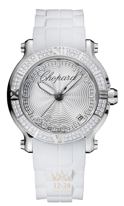 Часы Happy Sport 36 мм в корпусе из нержавеющей стали – это уникальное сочетание высочайшего часового мастерства и актуального спортивного дизайна, придающего модели энергию и выразительность. Подвижные бриллианты, скользящие над белым гильошированным циферблатом в обрамлении украшенного бриллиантами безеля, привносят в эту модель с белым каучуковым ремешком ту грацию, которая делает спортивные часы игриво-женственными и бескомпромиссно современными.