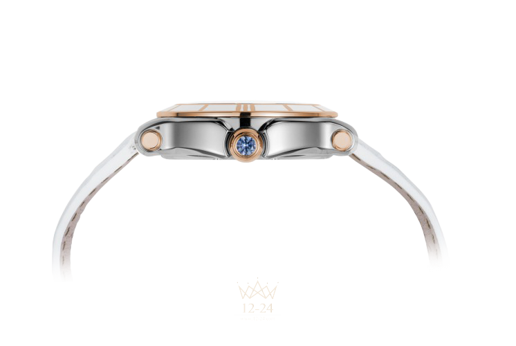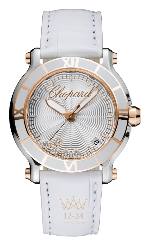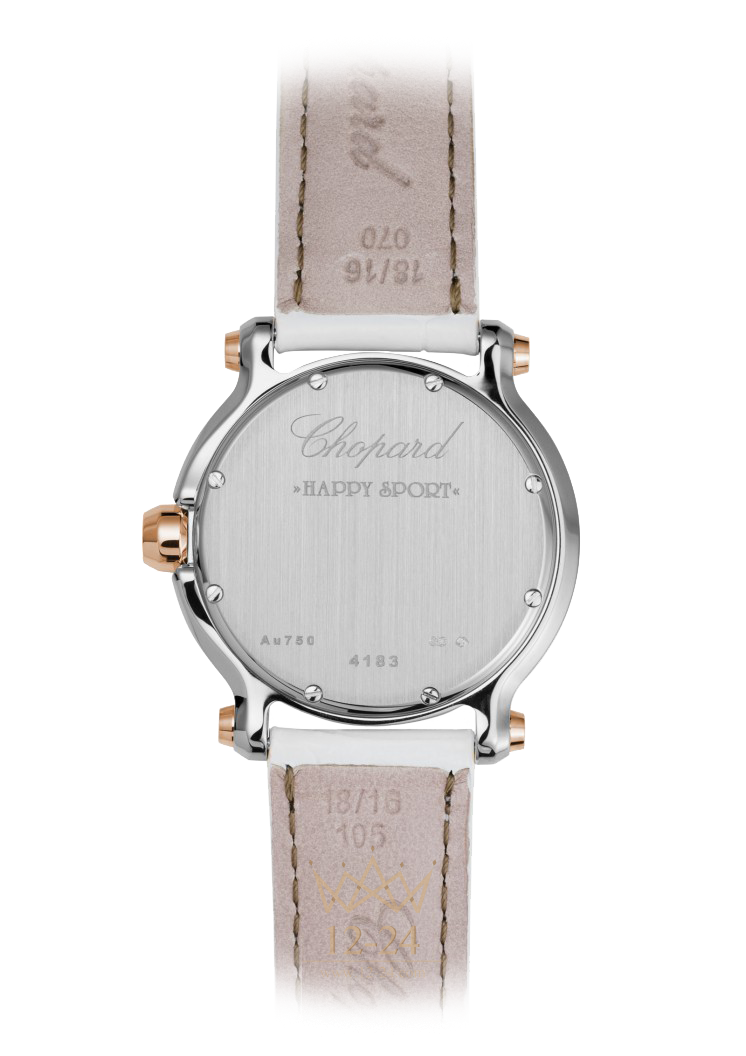 В этой спортивной, но одновременно чрезвычайно стильной модели Happy Sport энергичная нержавеющая сталь гармонично сочетается с драгоценным розовым золотом 750 пробы, выражая сущность современной женственности. Серебристый гильошированный циферблат добавляет часам нотку утонченности, на заводной коронке сияет сапфировый кабошон пастельно-голубого цвета, а фирменные подвижные бриллианты Chopard придают модели удивительную легкость.