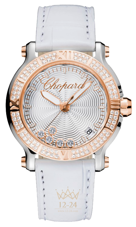 В этой спортивной, но одновременно чрезвычайно стильной модели Happy Sport энергичная нержавеющая сталь гармонично сочетается с драгоценным розовым золотом 750 пробы, выражая сущность современной женственности. Серебристый гильошированный циферблат добавляет часам нотку утонченности, на заводной коронке сияет сапфировый кабошон пастельно-голубого цвета, а фирменные подвижные бриллианты Chopard придают модели удивительную легкость.