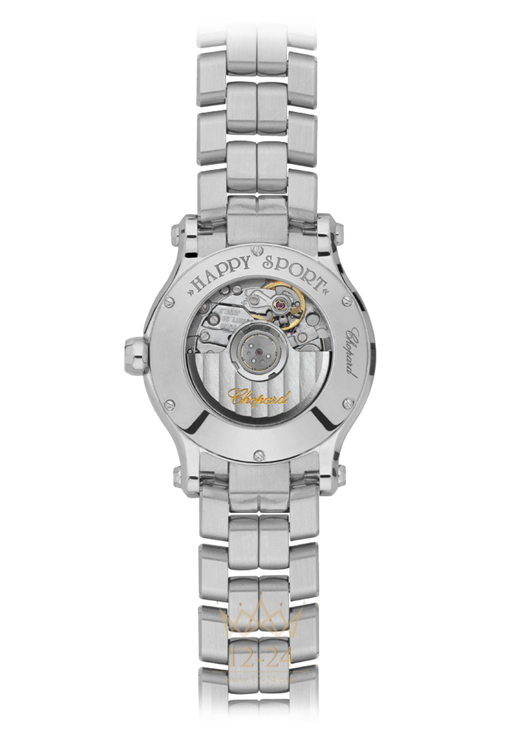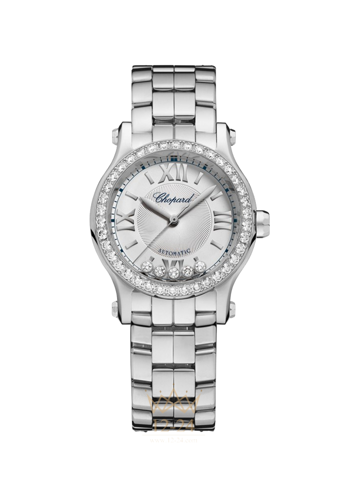 Часы Happy Sport 30 mm Automatic буквально искрятся женственностью. Их миниатюрный корпус из нержавеющей стали с украшенным бриллиантами безелем и браслетом из нержавеющей стали гармонично сочетает в себе нежные изгибы и яркий характер – само воплощение стиля Chopard. Серебристый циферблат часов с гильошированным мотивом в центре украшен роскошными римскими цифрами и изящными деталями. Пять знаменитых подвижных бриллиантов Chopard весело танцуют в вихре света.
