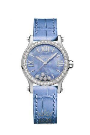 Роскошные женственные часы Happy Sport из нержавеющей стали (278573-3010) оснащены новым мануфактурным механизмом с автоматическим заводом, разработанным Chopard в честь 25-летия коллекции Happy Sport. Корпус из нержавеющей стали, в стиле Дома Chopard, дополняет циферблат из шелковистого, нежно переливающегося текстурированного перламутра светло-голубого цвета, с которым сочетаются кожаные ремешки в тон.
