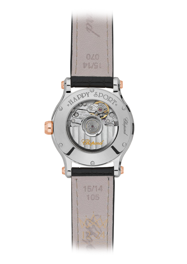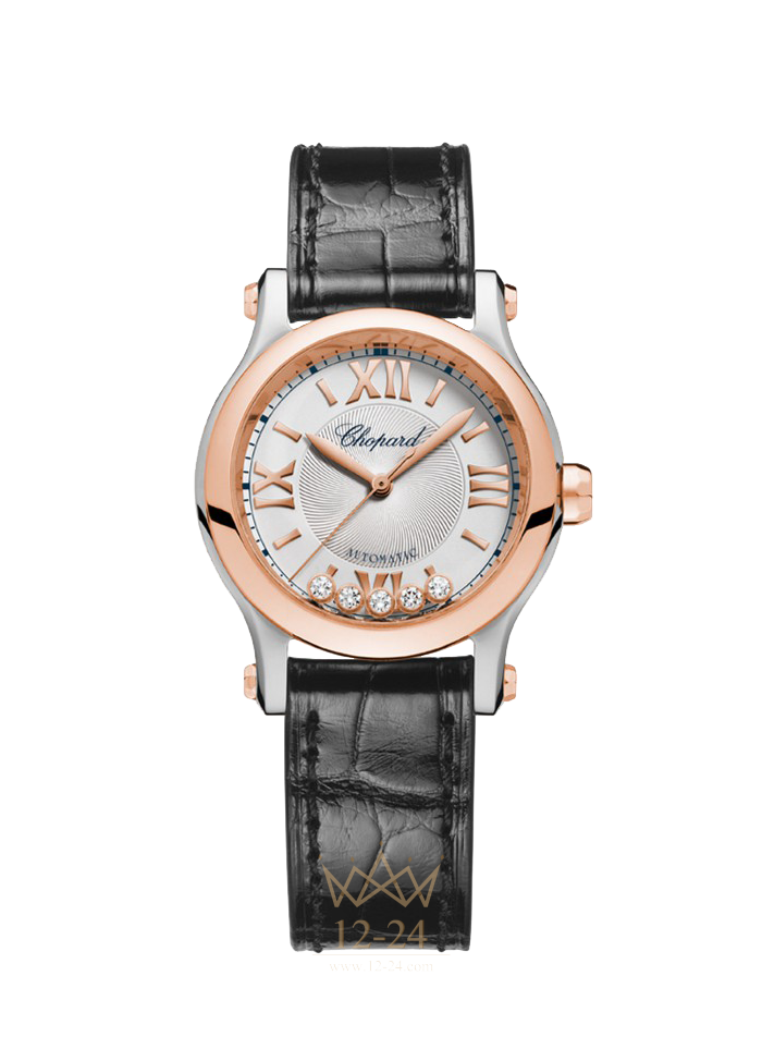 Стильные женственные часы Happy Sport 30 mm Automatic из розового золота 750 пробы и нержавеющей стали оснащены механическим калибром с автоподзаводом. Спортивный корпус небольшого размера на кожаном ремешке и современный серебристый циферблат с гильошированным мотивом в центре отражают представление Chopard о непринужденном стиле. Пять знаменитых подвижных бриллиантов Chopard весело танцуют в вихре света.