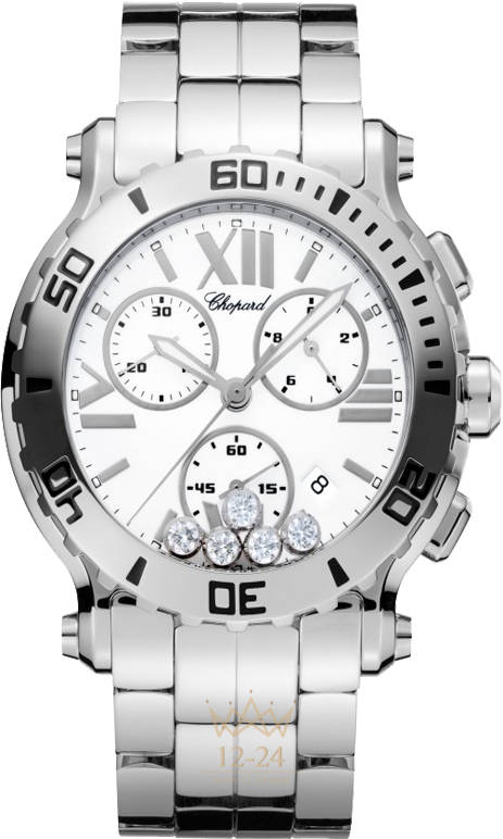 Часы Happy Sport Chrono в корпусе из нержавеющей стали – это союз спортивного стиля и женственности, апогей современного шика. Вращающийся безель и хронограф придают часам по-настоящему спортивный вид, а подвижные бриллианты, абсолютно свободно скользящие над идеально сбалансированным белым циферблатом, доказывают, что у Chopard часовое мастерство идет рука об руку с ювелирным искусством.