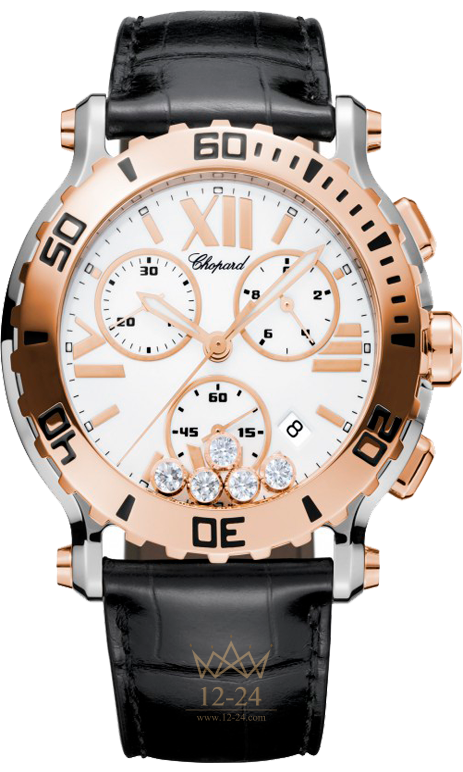Часы Happy Sport Chrono в корпусе из розового золота 750 пробы – это союз спортивного стиля и женственности, апогей современного шика. Вращающийся безель и хронограф придают часам по-настоящему спортивный вид, а подвижные бриллианты, абсолютно свободно скользящие над идеально сбалансированным циферблатом, доказывают, что у Chopard часовое мастерство идет рука об руку с ювелирным искусством.