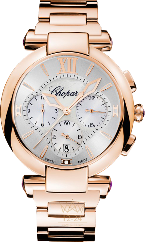 Оснащенные хронографом часы IMPERIALE сочетают в себе деликатную величественность и утонченный стиль. Корпус из розового золота 750 пробы на золотом браслете увенчан напоминающими античные колонны ушками с аметистами. Внутри него находится изящный серебристый циферблат с перламутровым центральным элементом. Величавые римские цифры, изящно очерченные стрелки, не перегруженный деталями корпус, заводная головка с аметистом в форме цветка лотоса превращают эти часы в квинтэссенцию стиля и элегантности.