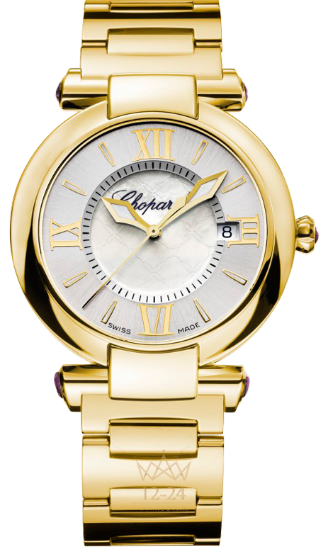 Тонкая игра изогнутых и прямых линий подчеркивается у часов IMPERIALE искусным комбинированием дорогих материалов. Утонченное сочетание часового корпуса и браслета из желтого золота 750 пробы с перламутровой вставкой на серебристом циферблате делает эти часы по-настоящему величественными. Как венец изысканности ушки корпуса и заводная головка украшены аметистами, которые своим цветом ассоциируются с пурпуром византийских императоров.
