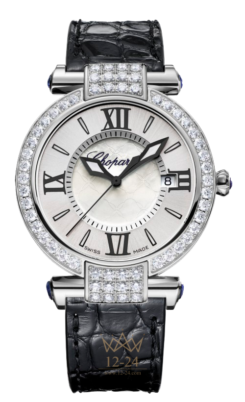 Тонкая игра изогнутых и прямых линий подчеркивается у часов IMPERIALE искусным комбинированием дорогих материалов. Сочетание часового корпуса из белого золота 750 пробы с изящной перламутровой вставкой на серебристом циферблате и бриллиантами на безеле делает эти часы по-настоящему величественными. Как венец изысканности ушки корпуса и заводная головка украшены сапфирами королевского синего цвета.