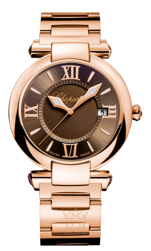 Модель IMPERIALE из розового золота 750 пробы являет собой союз высочайшего мастерства и абсолютной изысканности. Роскошный коричневый циферблат дополняют изящные стрелки, часовые индексы и королевские римские цифры, а аметистовые кабошоны цвета императорского пурпура придают часам благородный блеск. Образец сдержанной элегантности.
