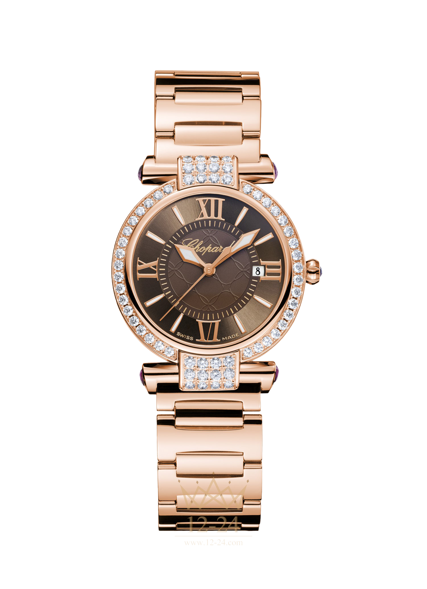 В модели IMPERIALE из розового золота 750 пробы с бриллиантами сочетаются высочайшее мастерство и абсолютная изысканность. Роскошный коричневый циферблат дополняют изящные стрелки и импозантные римские цифры, а аметистовые кабошоны цвета императорского пурпура, украшающие заводную коронку и ушки корпуса, придают часам царственное великолепие. Истинное воплощение сдержанной элегантности.