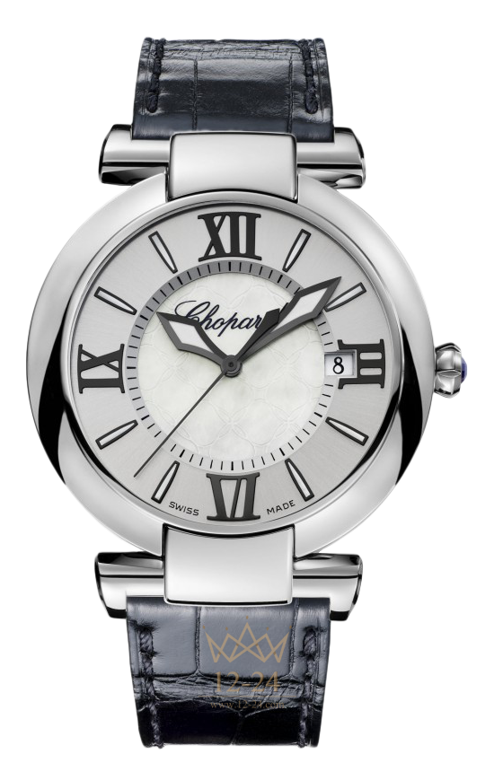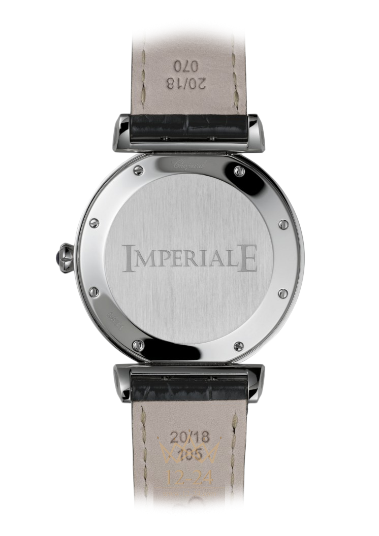 Часы IMPERIALE с автоматическим подзаводом в корпусе из нержавеющей стали представляют собой апогей утонченного дизайна. Изысканно изогнутые стрелки в стиле ампир ведут отсчет времени на серебристом циферблате с перламутровым элементом в центре и величественными римскими цифрами. Благородный цвет аметистового кабошона на заводной головке напоминает о пурпуре византийского императорского двора.