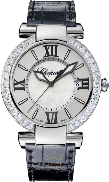 Лаконичность скульптурного дизайна этих стальных часов IMPERIALE разбавляется благородным блеском бриллиантов на безеле. Изысканно изогнутые стрелки в стиле ампир ведут отсчет времени на серебристом циферблате с перламутровым элементом в центре и величественными римскими цифрами. Благородный цвет аметистового кабошона на заводной головке напоминает о пурпуре византийского императорского двора.