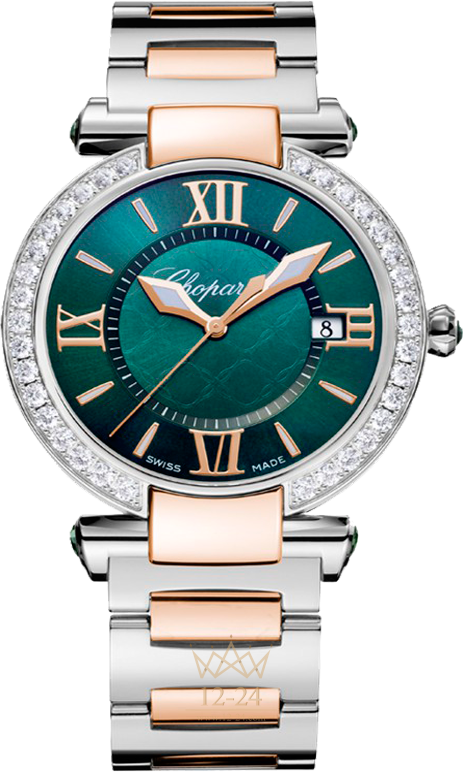Искусное чередование прямых и изогнутых линий подчеркивает утонченную элегантность часов IMPERIALE. Эффектное сочетание розового золота 750 пробы и нержавеющей стали, блеск украшенного бриллиантами ободка и насыщенный зеленый цвет циферблата делают эти часы по-настоящему величественными. Заводная коронка изысканно украшена турмалинами.