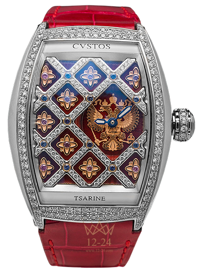Гильошированный, выполнен в технике решетки яйца Фаберже, инкрустированной белыми бриллиантами, синими и розовыми сапфирами, декорирован аппликацией золотого двуглавого орла