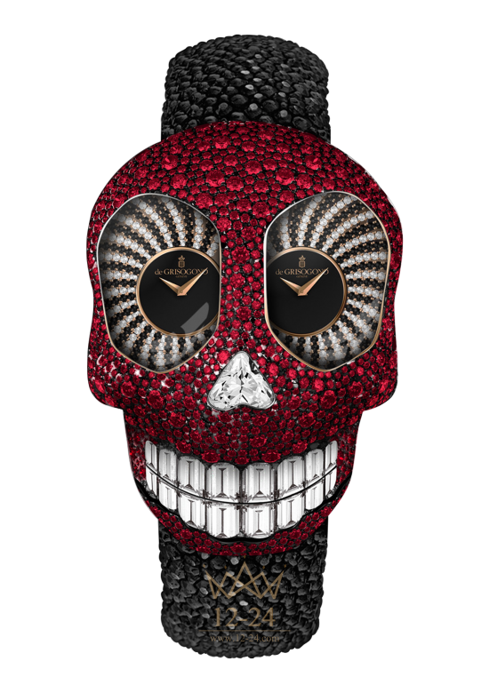 Корпус из розового золота с черным родиевым покрытием, паве из рубинов, бриллиант огранки «сердце», бриллианты багетной огранки, рубины. Кварцевые механизмы. Циферблаты с черным лаковым покрытием, белые и черные бриллианты. Стрелки Dauphine. Сапфировое стекло с антибликовым покрытием. Ремешок из кожи ската черного цвета. Раскладывающаяся застежка из розового золота с черным родиевым покрытием, паве из бриллиантов и рубинов.