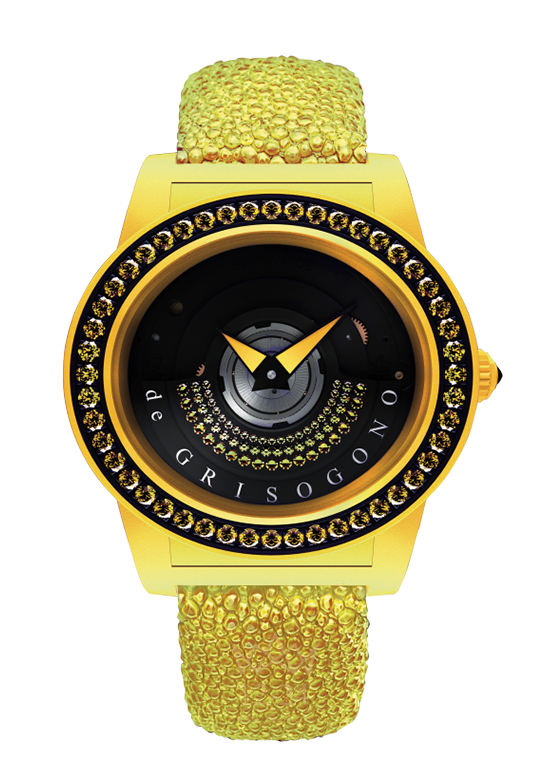 Корпус из желтого перламутрового фотолюминесцентного композитного стекловолокна с желтыми сапфирами. Черненый реверсивный ротор с отделкой камнями. Стрелки Dauphine с люминесцентным покрытием SLN желтого цвета. Сапфировое стекло с антибликовым покрытием. Ремешок из кожи ската желтого цвета. Раскладывающаяся застежка из желтого перламутрового фотолюминесцентного композитного стекловолокна и стали с черным PVD-покрытием. Заводная головка из желтого перламутрового фотолюминесцентного композитного стекловолокна с черным бриллиантом. Водонепроницаемость 3 АТМ.