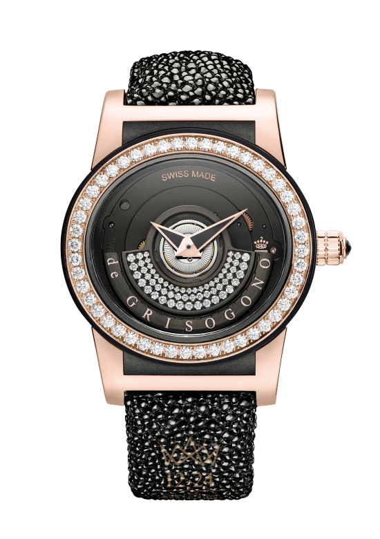 Индикация часов и минут. Корпус из розового золота и черного перламутрового фотолюминесцентного композитного стекловолокна, безель из розового золота с 48 белыми бриллиантами. Циферблат оснащен черненым реверсивным ротором с 60 белыми бриллиантами и стрелками Dauphine с белым люминесцентным покрытием SLN. Заводная головка из розового золота с 1 черным бриллиантом. Ремешок из черной кожи ската, отделка из розового золота и тройная раскладывающаяся застежка из стали с черным PVD-покрытием.