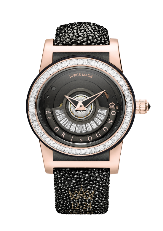 Индикация часов и минут. Корпус из розового золота и черного перламутрового фотолюминесцентного композитного стекловолокна, безель из розового золота с 56 белыми бриллиантами багетной огранки. Циферблат оснащен черненым реверсивным ротором с 12 белыми бриллиантами багетной огранки и стрелками Dauphine с черным люминесцентным покрытием SLN. Заводная головка из розового золота с 1 черным бриллиантом. Ремешок из черной кожи ската, отделка из розового золота и тройная раскладывающаяся застежка из стали с черным PVD-покрытием.