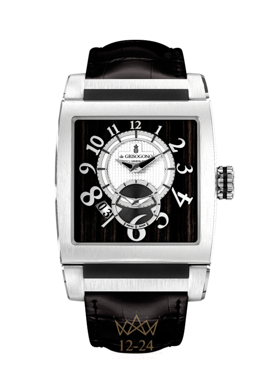 Корпус из сатинированного белого золота и титана с черным матовым PVD-покрытием. Автоматический механизм. Циферблат из темного эбенового дерева, серебристый верхний счетчик с узором «парижские гвозди», сатинированный темный нижний счетчик, метки из полированного белого золота. Стрелки Dauphine с люминесцентным покрытием SLN черного цвета. Сапфировое стекло с антибликовым покрытием, задняя крышка из сапфирового стекла с антибликовым покрытием. Ремешок из черной матовой кожи аллигатора. Раскладывающаяся застежка из белого золота и стали с черным матовым PVD-покрытием. Заводная головка с гербом de GRISOGONO. Водонепроницаемость 5 АТМ.