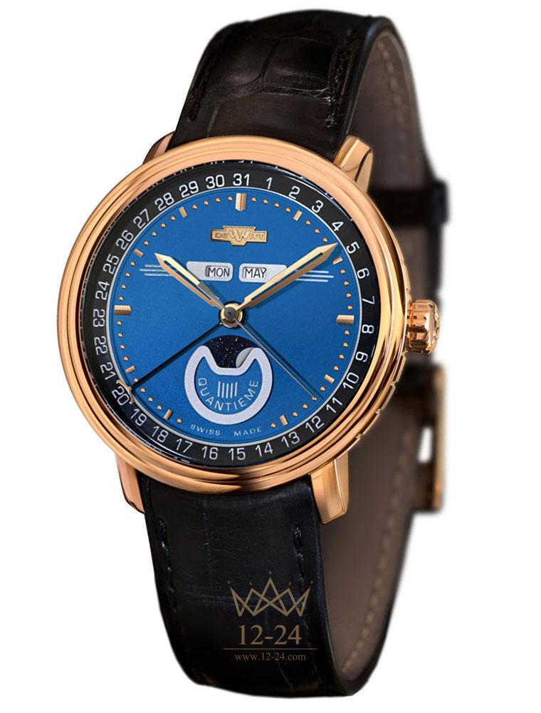 Искрящееся теплотой розовое золото окаймляет синий циферблат со скелетонизированными стрелками, накладными часовыми индексами в виде точек и черточек золотистого цвета. На краях часового диска шкала из маленький белых арабских цифр, нанесенных на черной подложке. В положении на двенадцати часах помещена эмблема бренда DeWitt, а на шести часах красуется лого линейки Quantieme.