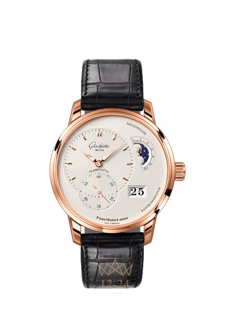 Новая модель PanoMaticLunar представлена в трех вариантах оформления. Лидирует модель в корпусе из красного золота, демонстрируя серебристый циферблат тёплого оттенка с часовой, минутной и секундной стрелками, а также часовыми рисками из красного золота. На диске эффектного указателя фаз Луны золотая Луна и золотые звёзды сияют на фоне тёмно-синего ночного неба.