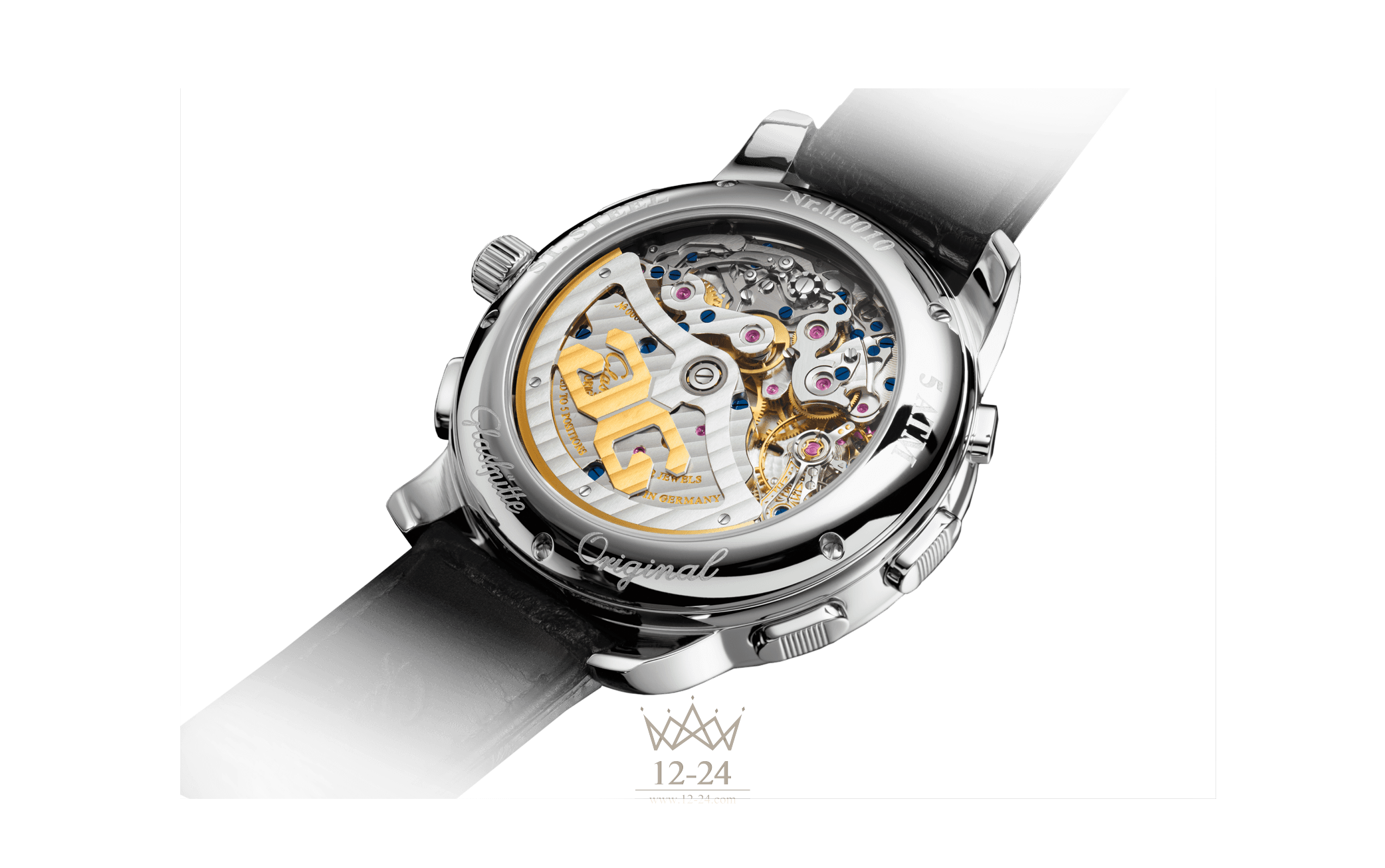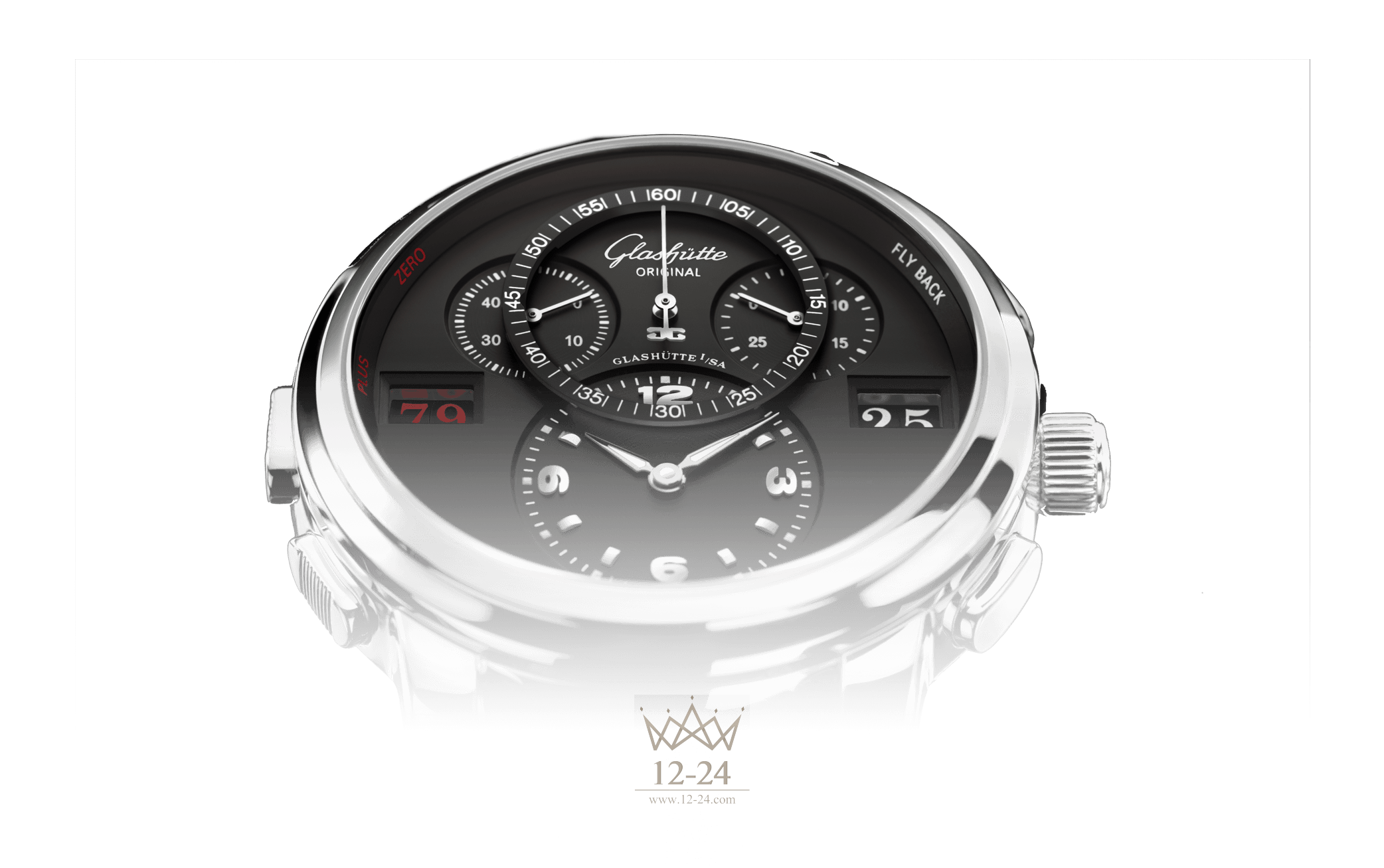 В положении «3» часа напротив окошка счетчика расположена апертура характерной для Glashütte Original, очень наглядной «панорамной даты» с «бесшовной» индикацией белыми цифрами на черном фоне.