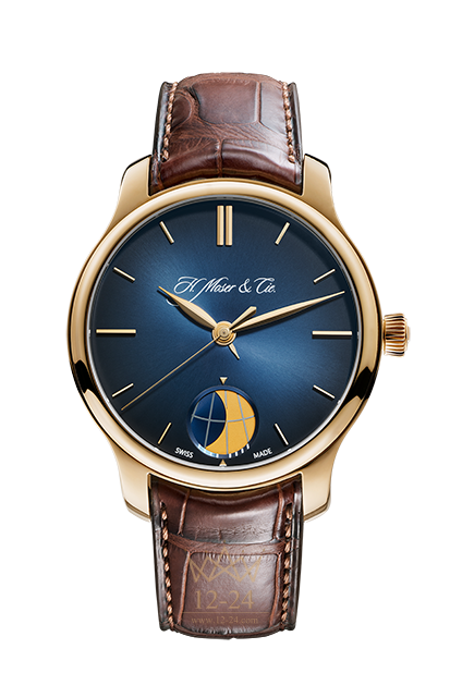 Endeavour Moon имеет трёх составный корпус из розового золота, тёмно-синий циферблат с градацией цвета и гильоше «Солнечные лучи», прошитый вручную ремешок из коричневой кожи аллигатора и раскладывающуюся застёжку из розового золота.