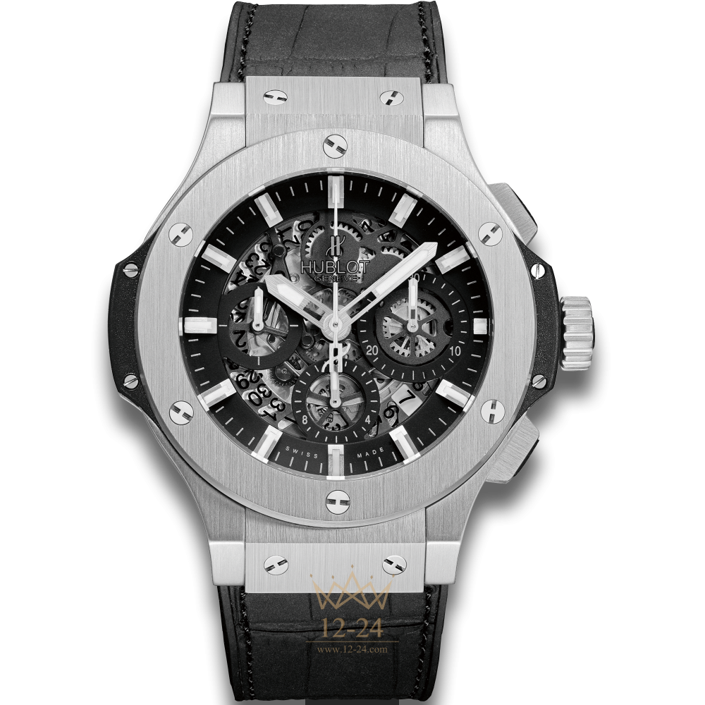 Матовый черный скелетонизированный циферблат. Сатинированные накладные элементы и стрелки с родиевым покрытием и белым люминесцентным покрытием.