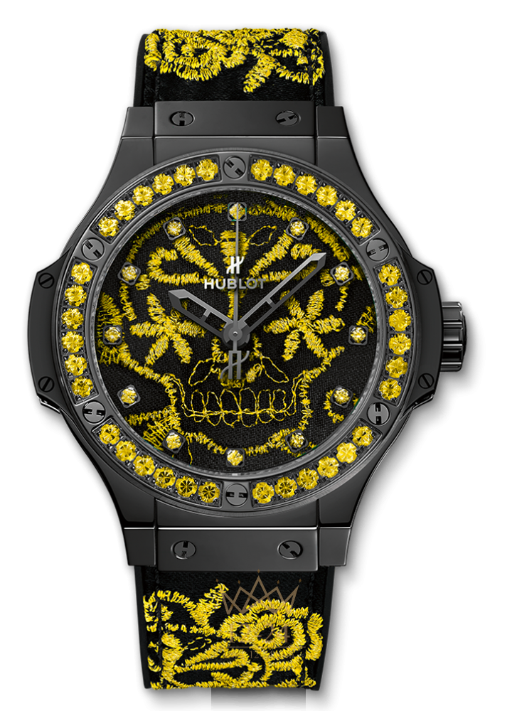 Механизм с автоподзаводом, калибр HUB1110, 63 компонента, 21 камень, частота колебаний 28800 пк/ч, запас хода 42 ч. Корпус выполнен из керамики. Безель украшен 36-ю желтыми сапфирами. Коронка выполнена из метала, соответствующего материалу корпуса, с резиновой вставкой. Стекло сапфировое с антибликовым покрытием. Задняя крышка выполнена из керамики с вставкой антибликового сапфирового стекла. Циферблат украшен цветной вышивкой. Часовые маркеры инкрустированы 12-ю желтыми сапфирами. Водонепроницаемость составляет 100 м. Каучуковый ремешок с вышивкой на 100% черном шелковом ремешке. Застежка выполнена из нержавеющей стали. Часы выпущены ограниченной серией 100 штук.