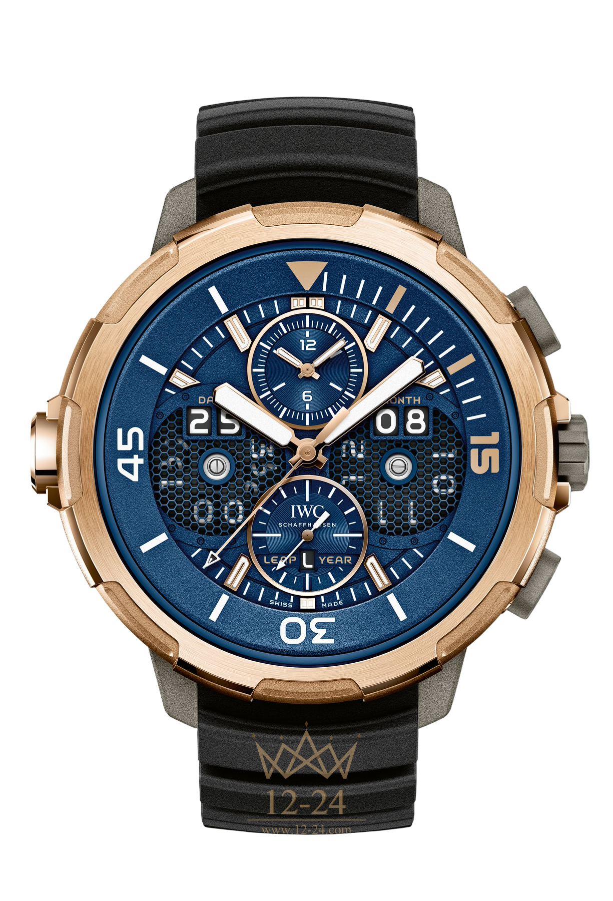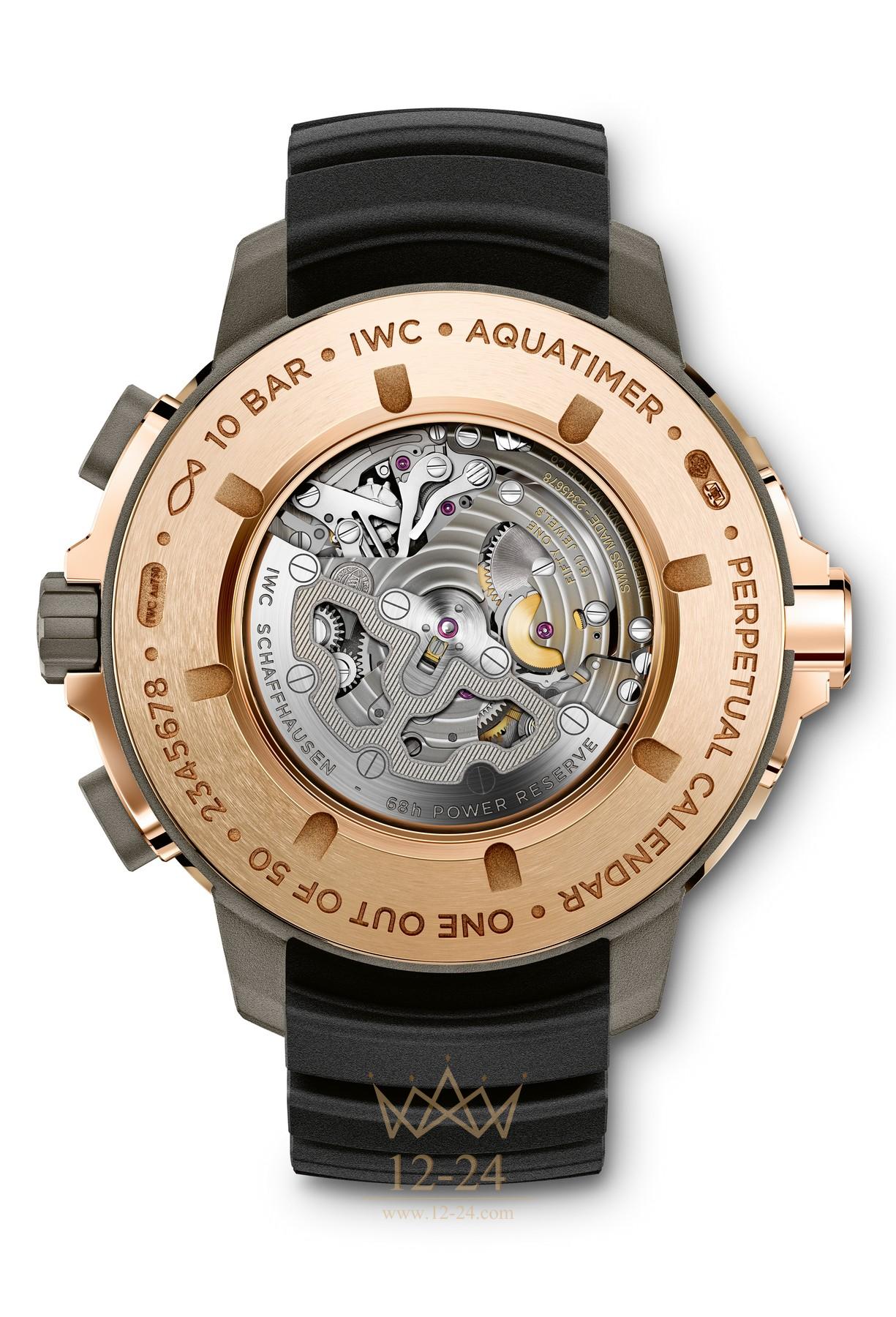 Для перевода большого диска указателя месяца в часах Aquatimer Perpetual Calendar Digital Date-Month (IW379402) запаса мощности мануфактурного автоматического калибра 89801 было бы недостаточно. Поэтому каждую ночь в момент перевода даты специальный быстродействующий переключатель сохраняет определенное количество энергии, которая высвобождается в конце месяца. Модель Aquatimer Perpetual Calendar Digital Date-Month с впечатляющим по размеру корпусом (49 мм в диаметре) — вторые по величине часы в истории IWC после Big Pilot’s Watch 1940 года выпуска.