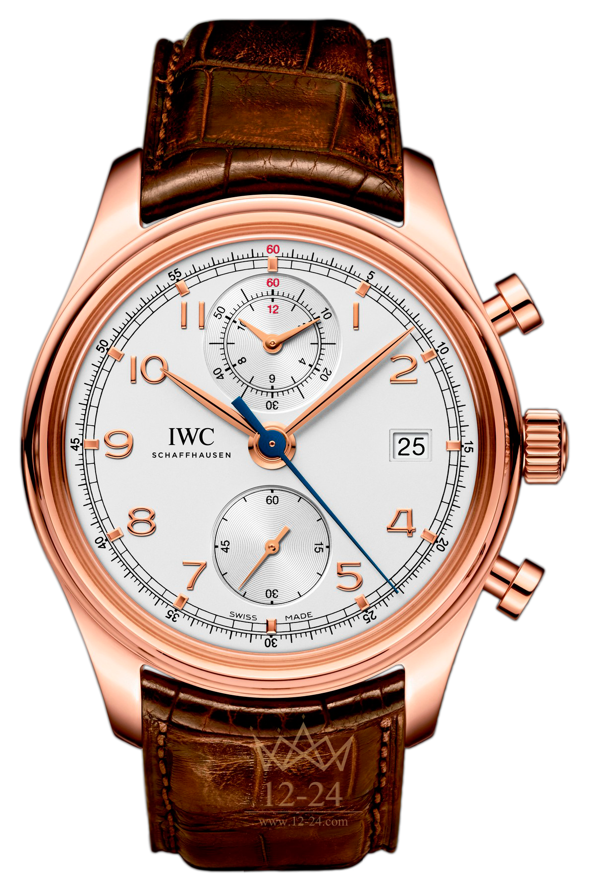 Новый хронограф семейства Portugieser можно назвать прямым наследником модели Артикул 3714. Его циферблат увеличился в диаметре и стал на 2 мм выше, но это не бросается в глаза, благодаря стеклу с изогнутыми краями. Дизайн данного классического варианта вместе с минутной шкалой в «железнодорожном» стиле (как и в предыдущей модели) гармонично сбалансирован. Для Portugieser Chronograph Classic был специально разработан калибр 89361 производства IWC. Он дал возможность разместить на циферблате 12-часовую разметку, которая позволяет считывать время обычным способом. Через прозрачную заднюю крышку из сапфирового стекла проглядывает ротор, украшенный узором «женевские полоски». Все модели выпускаются с ремешком Santoni из кожи аллигатора.