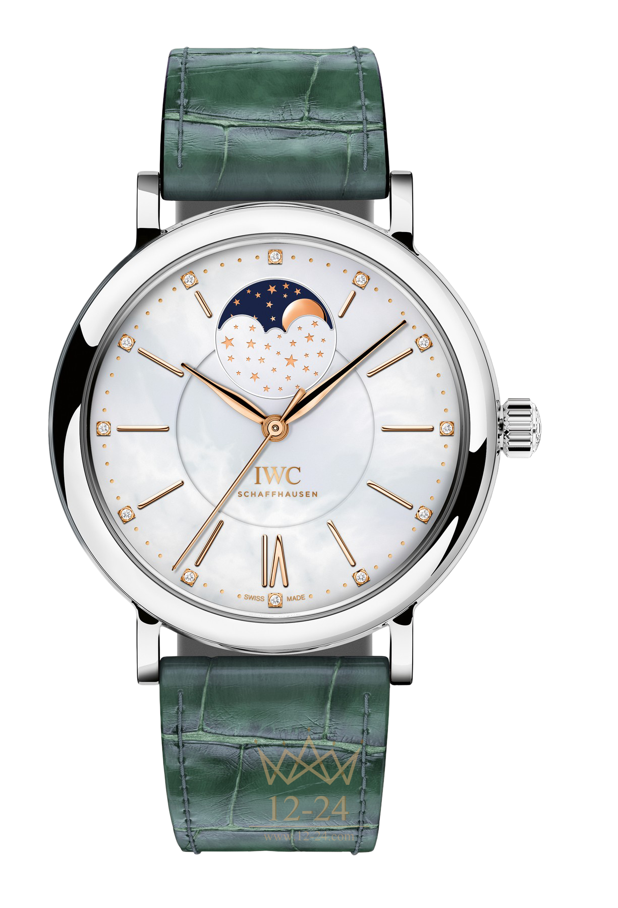 Для циферблата часов Portofino Automatic Moon Phase 37 в корпусе из розового золота и нержавеющей стали дизайнеры IWC подобрали идеальное решение – слегка мерцающее белое и черное перламутровые покрытия. Изящный и спокойный рисунок перламутра дарит циферблату неповторимую глубину и выразительность. Ободок, украшенный 66 бриллиантами, придает часам удивительное сияние. Часы дополнены ремешками Santoni из кожи аллигатора, а один из вариантов в корпусе из розового золота дополнен высококачественным браслетом «миланского плетения».
