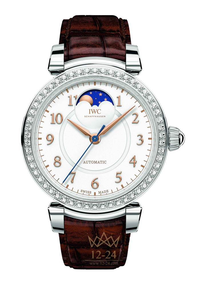 Модель IW459307 представлена в корпусе из нержавеющей стали с ободком, украшенным 54 бриллиантами чистой воды. Ее элегантно дополняет темно-коричневый ремешок из кожи аллигатора с застежкой-бабочкой. Золотистые отблески цифр, а также часовой и минутной стрелок и цветовой акцент синей секундной стрелки гармонично сочетаются с золотисто-синим указателем фаз Луны на посеребренном циферблате.