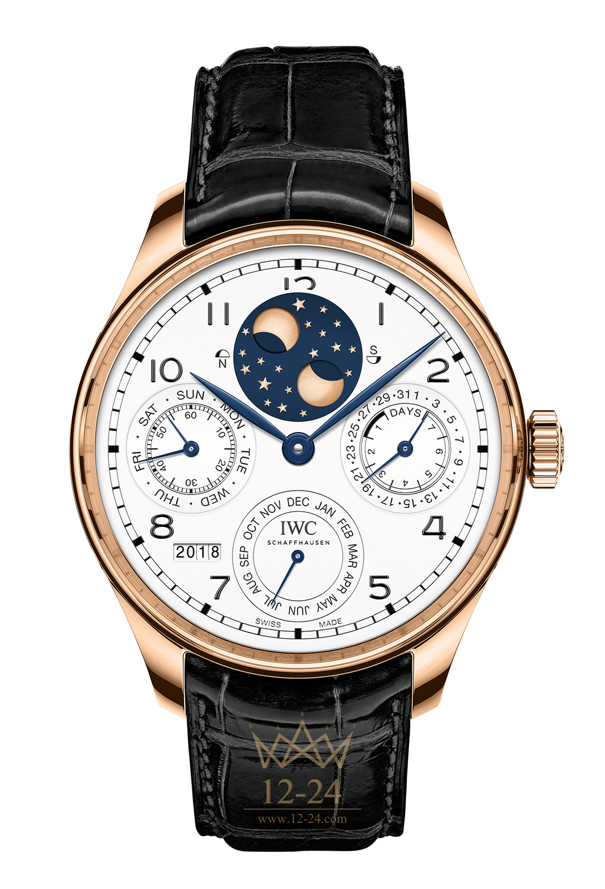 Вечный календарь относится к характерным усложнениям серии IWC Portugieser. В юбилейный год компания представляет эксклюзивную версию модели. Часы Portugieser Perpetual Calendar Edition «150 Years» (IW503405) выпущены лимитированной серией из 250 экземпляров с корпусом из 18-каратного розового золота, белым лакированным циферблатом и синими стрелками.