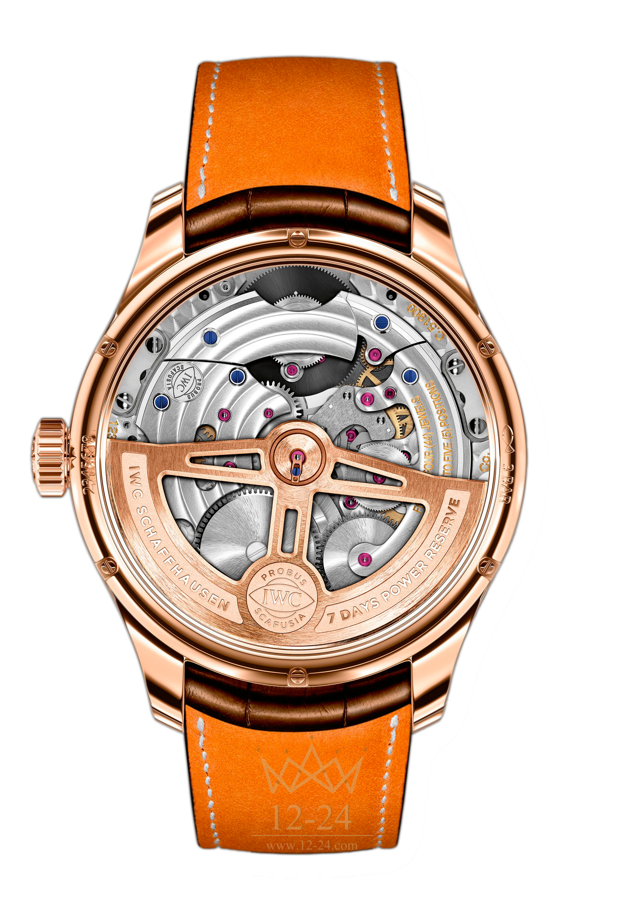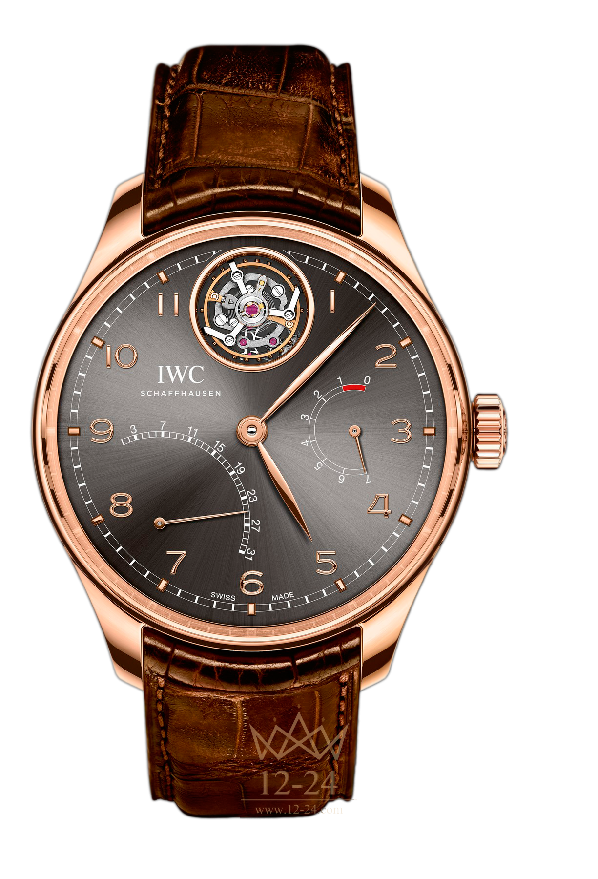 Любители часового искусства ценят в часах Portugieser Tourbillon Mystère Rétrograde магическую инсценировку, центральный элемент которой – «парящий» турбийон из 82 деталей. Волшебный механизм словно оживляет отметку «двенадцать». Ретроградный указатель даты устроен таким образом, что на границе между 31 и 1 числом каждого месяца его стрелка автоматически возвращается к началу шкалы. Если в месяце меньше дней, стрелку можно подвести самостоятельно при помощи функции быстрой настройки. Индикатор 7-дневного запаса хода информирует владельца об уровне завода мануфактурного калибра 51900. К 75-летнему юбилею Portugieser (Португизер) мануфактура IWC Schaffhausen выпустила «мистическую диву» в новом облике. Стекло циферблата с изогнутыми краями делает часы еще более элегантными и гармоничными. Улучшенные эргономические характеристики крепления ремешка обеспечивают комфорт при ношении даже владельцам с узким запястьем. Модель дополнена эксклюзивным ремешком из кожи аллигатора производства дома Santoni. Обратная сторона часов также привлекательна. Ротор из цельного розового золота обрел изящные формы и ажурные прорези, что позволяет насладиться удивительным мануфактурным калибром IWC, украшенным воронеными винтами. На циферблате Portugieser Tourbillon Hand-Wound турбийон (от фр. «вихрь») вращается возле отметки «9 часов». Один раз в минуту он совершает оборот вокруг собственной оси, тем самым нивелируя погрешности амплитуды колебаний баланса, возникающие под воздействием гравитации. Сквозь прозрачную заднюю крышку из сапфирового стекла можно увидеть мануфактурный калибр 98900 с искусно оформленным никелированным трех-четвертным мостом из нейзильбера.
