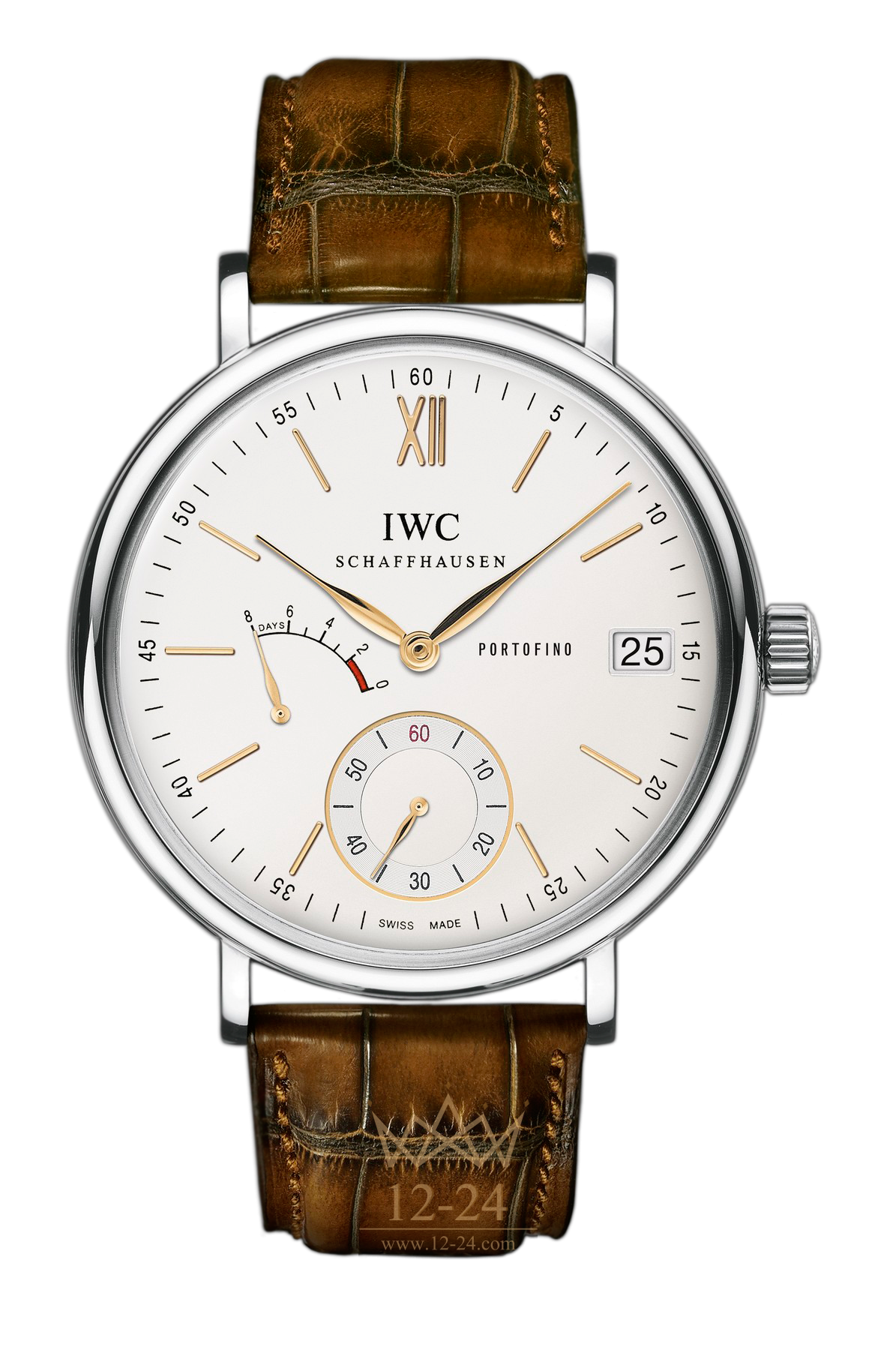 В жизни каждого человека бывают моменты, которых ждешь с нетерпением. Таким долгожданным событием в 2011 году для многих ценителей часового искусства стала премьера часов Portofino Hand-Wound Eight Days. Мануфактурный калибр 59210, разработанный компанией IWC, обеспечивает точный и бесперебойный ход в течение 192 часов, или 8 суток, после чего механизм автоматически останавливается. Индикатор запаса хода, расположенный между отметками «8 часов» и «9 часов», позволяет в любой момент времени определить уровень запаса хода механизма. Малая секундная стрелка около отметки «6 часов» и указатель даты возле отметки «3 часа» дополняют оформление циферблата, завершая его идеально сбалансированный образ. Высокую точность хода обеспечивают баланс без градусника с частотой 28 800 полуколебаний в час и классическая пружина Бреге изогнутой формы. Часы выпускаются в корпусе из нержавеющей стали, с посеребренным циферблатом и часовыми метками, с золотым покрытием. Эта модель оснащена прозрачной задней крышкой из сапфирового стекла и дополнена ремешком Santoni из кожи аллигатора.