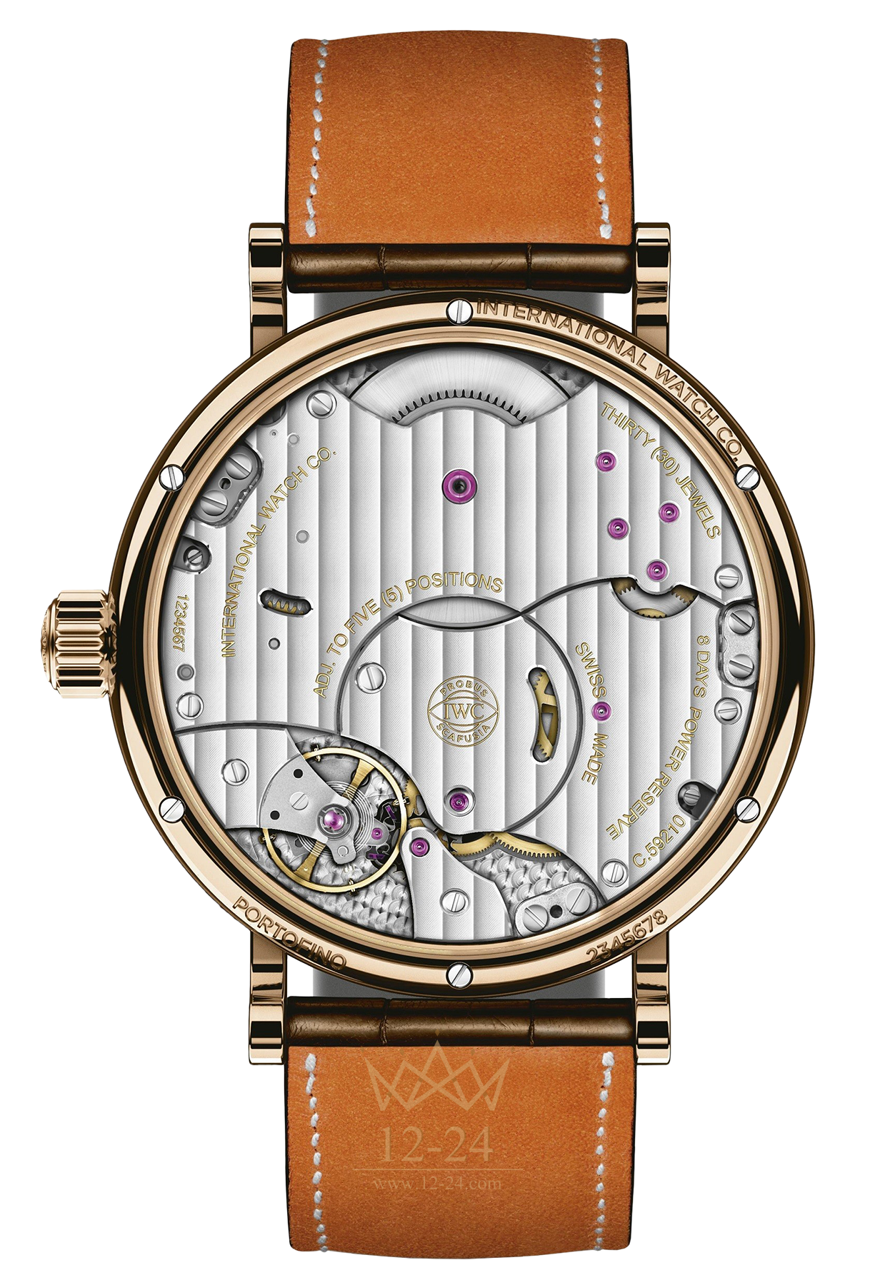 Данный оптоволоконный пучок закрывает зазор и проецирует дату непосредственно на циферблат. Для владельцев часов Portofino одним из редких удовольствий стала возможность заводить часовой механизм один раз в неделю. Полностью заведенный часовой механизм продолжает работать 192 часа, после чего автоматически останавливается. Индикатор запаса хода в положении «9 часов» показывает оставшееся количество энергии, причем два последних дня выделены красным цветом.