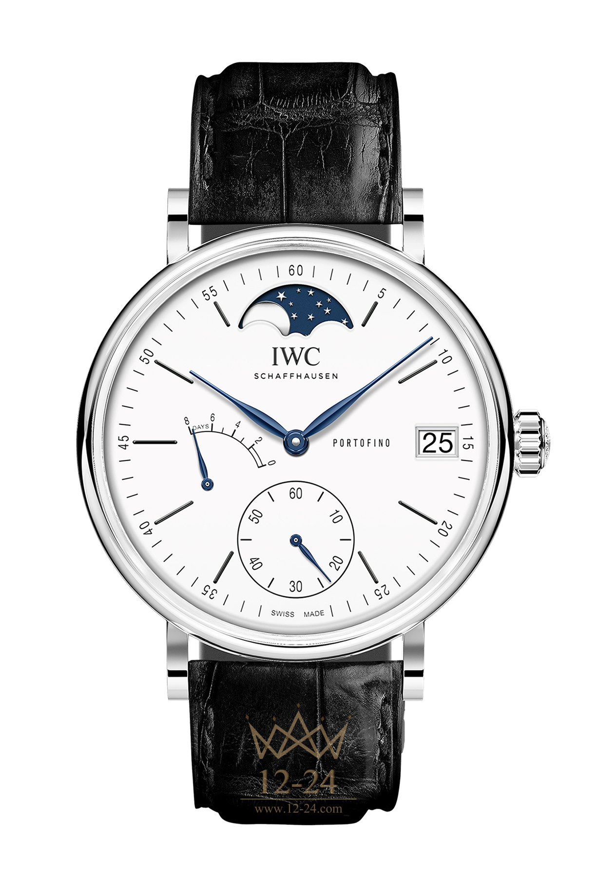 Часы Portofino Hand-Wound Moon Phase Edition «150 Years» (IW516406) созданы на основе классической модели Portofino Hand-Wound Eight Days, дополненной указателем фаз Луны у отметки «12 часов». Калибр 59800 производства IWC с ручным подзаводом из семейства 59000 был усовершенствован с помощью интегрированного модуля указателя фаз Луны, показания которого корректируются на одни сутки лишь раз в 122 года. Индикатор запаса хода находится у отметки «9 часов».