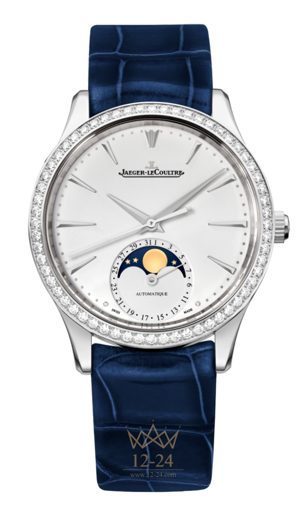 В часах Master Ultra Thin Moon (1258401) из стали представлен указатель фаз Луны — сложной функции, пользующейся особой популярностью у женщин. Инкрустация бриллиантами подчеркивает ювелирный характер этой модели. Лаконичный циферблат с узором «солнечные лучи» и метками с родиевым покрытием обрамляет безель, украшенный бриллиантами классической огранки. В большом окошке около метки «6» часов отображаются фазы Луны, являющейся во многих культурах воплощением женственности и таинственности. Поистине завораживающее зрелище.