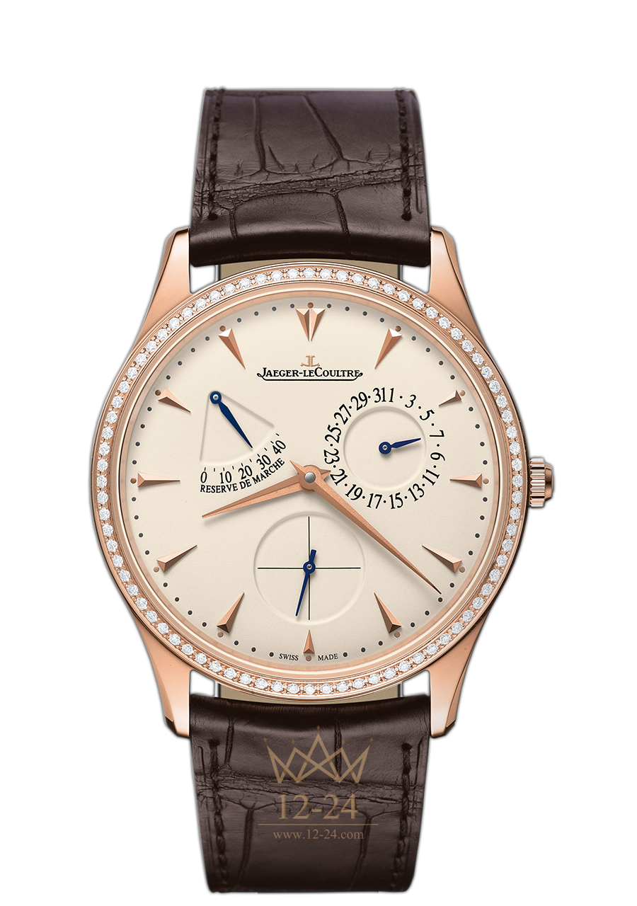 Швейцарская часовая мануфактура Jaeger-LeCoultre представила новую версию модели Master Ultra Thin Réserve de Marche, которая выпускается в корпусе из 18-каратного розовом золота с украшенным бриллиантами безелем.