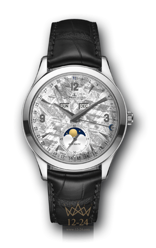 Наконец любители модели Master Calendar увидят долгожданную обновленную версию в 2015 году. По своей сути ничего не изменилось в функциях, на этот раз изменения затронули самую видную часть часов - циферблат. Новинка будет выпущена с новым, метеоритным циферблатом, который придает каждой модели уникальности, ведь один и тот же рисунок, отблеск метеорита невозможно повторить. Часы выполнены в корпусе из нержавеющей стали в довольно удобном диаметре для классики - 39 миллиметров и толщиной в 10,6 мм. Механизм с автоподзаводом, Calibre 866 с запасом хода в 43 часа, состоит из 305 деталей, собран на 32 камнях. На метеоритно-графитовом циферблате отчетливо видны центральная часовая и минутная стрелки с люминесцентным покрытием. Еще одна центральная стрелка с синим полумесяцем указывает на дату. Малая секундная стрелка совмещена с индикатором фаз Луны, который расположен на 6 часов. Два белых окошка в положении под 12 часами указывают день недели и месяц. Ремешок из кожи аллигатора черного цвета прошит вручную с классической застежкой из стали.