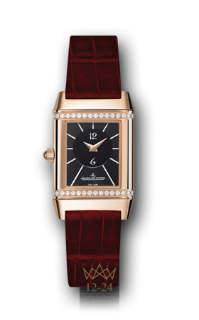 Женские Duetto - это очаровательный дуэт двух контрастирующих друг с другом циферблатов, которые можно переворачивать по настроению, благодаря уникальному корпусу "реверсо" из розового золота. Первый циферблат выполнен в традиционном стиле "ар-деко", с гильошированным узором в виде расходящихся лучей, окруженных изящными арабскими цифрами, словно выписанными от руки. Второй циферблат черного цвета украшен золотой разметкой. Корпус украшен бриллиантами.