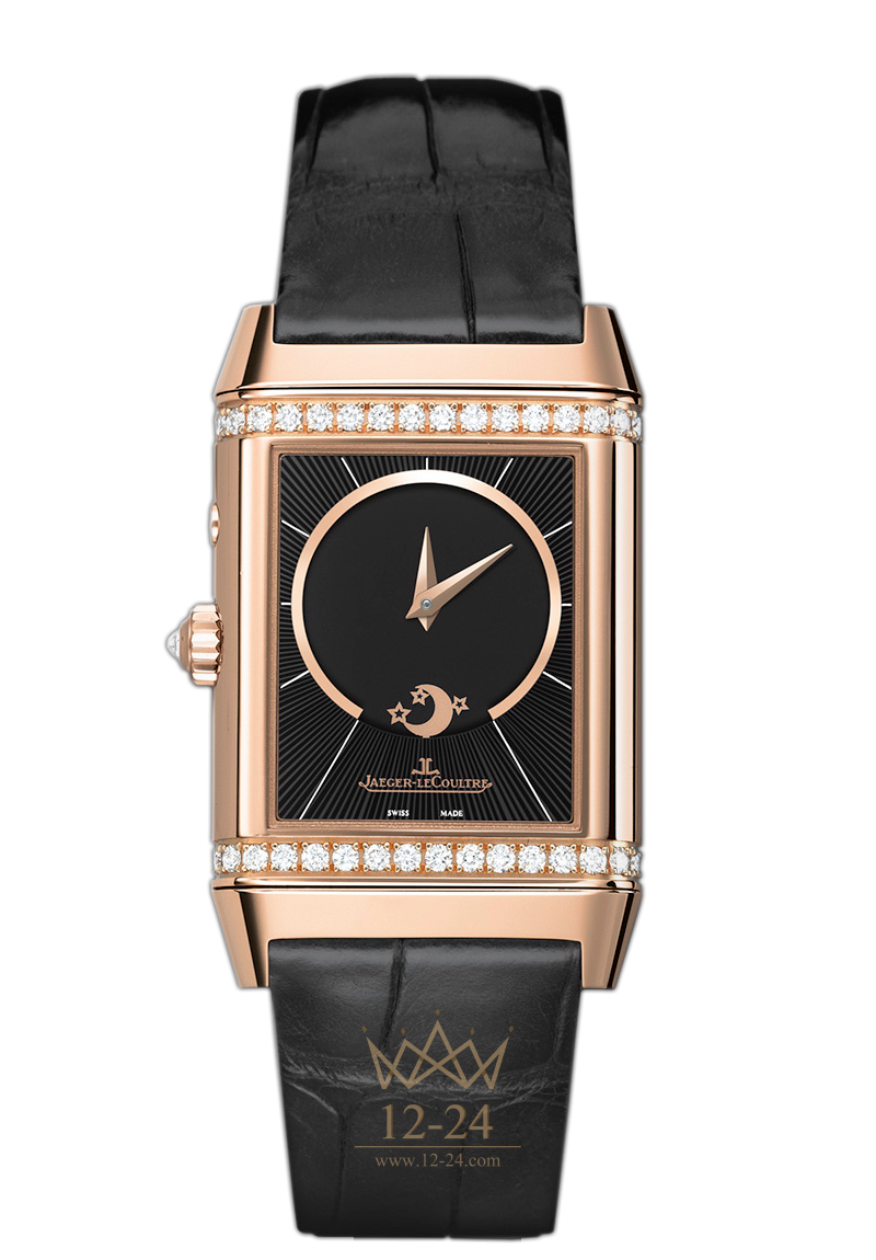 Женские Duetto - это очаровательный дуэт двух контрастирующих друг с другом циферблатов, делающие процесс определения времени во второй часовой зоне простым и приятным - благодаря уникальному корпусу "реверсо" из розового золота. Первый циферблат выполнен в традиционном стиле "ар-деко", бело-серебристого цвета, с изящными арабскими цифрами, словно выписанными от руки. Второй циферблат черного цвета отвечает за время второй часовой зоны с указателем день/ночь.