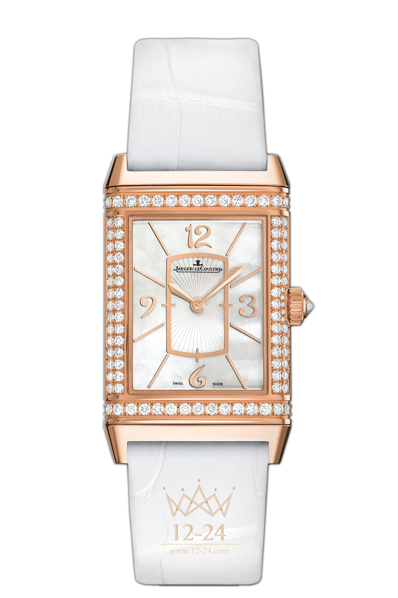 Новая стильная модель Reverso Grande Lady Ultra Thin 3212402 выпущена в 2013 году, не оставит равнодушной ни одну женщину и будет особенно интересна любительницам розового золота 750 пробы с большим количеством бриллиантов и самое главное с перламутровым циферблатом, на изящном кожаном белоснежного цвета ремешке, которая идеально вступит в тандем с украшениями из этого же метала. Часы имеют новое лицо и характер, гладкие полированные углы и тонкие линии придают модели, нового дыхания и утонченности. Мастера сделали корпус максимально тонким 7.9 мм, для большего комфорта и легкости. Что несомненно радует, что в этот тонкий корпус вмещен механизм с ручным заводом Calibre 846/1 с частотой колебаний баланса - 21 600 пк/час имеет 18 камней, толщина 2,94 мм, 93 детали, запас хода 40 часов. Элегантные, утонченные часовая и минутная стрелки из розового золота гармонично сочетаются с выраженными арабскими цифрами 12,3,6,9 на перламутровом белоснежном циферблате и корпусом так же выполненной из 18 каратного розового золота. Безель инкрустирован 93 бриллиантом ~1.02 carats. Раскладной застежкой размера 16 мм из розового золота.