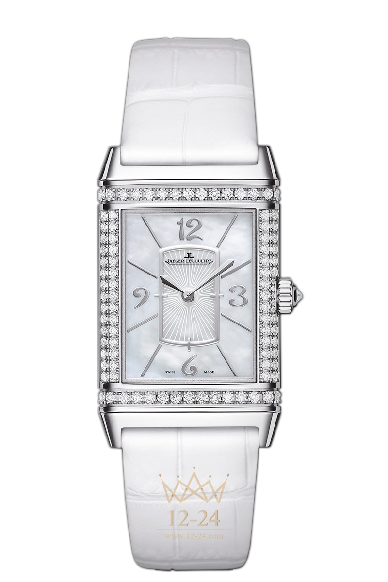 Новая стильная модель Reverso Grande Lady Ultra Thin выпущена в 2013 году, не оставит равнодушной ни одну женщину и будет особенно интересна любительницам белого золота инкрустированного бриллиантами в сочетании с белоснежным перламутровым циферблатом. Часы имеют новое лицо и характер, гладкие полированные углы и тонкие линии придают модели, нового дыхания и утонченности. Мастера сделали корпус максимально тонким 7.9 мм, для большего комфорта и легкости, добавив небольшое количество бриллиантов. Что несомненно радует, что в этот тонкий корпус вмещен механизм с ручным заводом Jaeger-LeCoultre Calibre 846/1 с частотой колебаний баланса - 21 600 пк/час имеет 18 камней, толщина 2,94 мм, 93 детали, запас хода 40 часов. Элегантные, утонченные часовая и минутная стрелки из белого золота гармонично сочетаются с выраженными арабскими цифрами 12,3,6 и 9 на перламутровом белоснежном циферблате. Безель инкрустирован 93 бриллиантами ~1.02 carats. Ремешок белый из кожи аллигатора с раскладной застежкой размера 16 мм из белого золота.