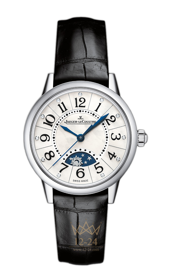 Новая модель 2014 года Rendez-Vous Night & Day была представлена в более миниатюрном варианте, и теперь составляет всего 29 мм, которые обновили циферблат с необычным указателем дня и ночи, мечевидными стрелками и небольшими бриллиантами, которыми украшены часовые индексы на перламутровом циферблате. Сохранив щедрые пропорции, разработанные в часовом стиле коллекции является верным спутником для женщин, которые увлечены красотой ювелирных мастеров. На изысканном перламутровом циферблате вместо меток ~11 бриллиантов ~0.02 carats расположена центральная часовая, минутная и секундная стрелка из вороненой стали синего цвета. Изображения Солнца, Луны и звезд, является указателем дня и ночи в положении на 6 часов. Модель оснащена механизмом с автоматическим подзаводом, Jaeger-LeCoultre Calibre 967A собран на 28 камнях с балансовой частотой 28800 пол/час, с запасом хода в 42 часа. Черный ремешок из кожи аллигатора с раскладной стальной застежкой размером 12 мм, придает часам неповторимую женскую изысканность.