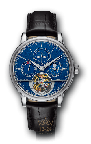 Корпус этих часов выполнен из 18-каратного белого золота. Обладает стойкостью к влаге до 5 атм. Удобный корпус диаметром - 42,00 мм и толщиной - 13,10 мм. Синий зернистый циферблат с центральными стрелками: часов и минут. Индикатор день/ночь совмещен с индикатором фазы Луны в положении на 3 часа. Отдельно отведено место дате в положении на 9 часов. Диск с указательной стрелкой месяца и знаков зодиака в положении на 12 часов, в центре которого разместилось окошко указателя года. Каретка турбийона заняла место в положении на 6 часов. Преимущество такого вечного календаря из-за ясности предоставляемой информации и простоты в использовании.