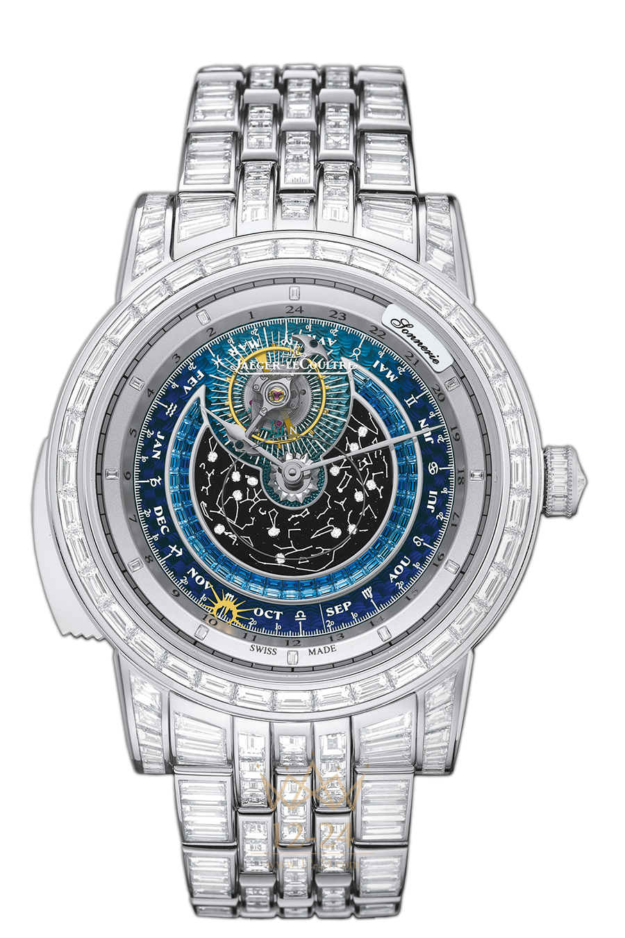 Эта модель швейцарских наручных часов фирмы Jaeger-LeCoultre представлена в корпусе, изготовленном из белого золота. Обладает механизмом с ручным заводом. Функциями модели являются: часы, минуты, турбийон, минутный репетир, месяц, 24-часовой дисплей. Максимальная водонепроницаемость корпуса - 50 метров. Диаметр корпуса - 46.7 мм, толщина - 15.9 мм. Он украшен 64 сапфирами и 524 бриллиантами. Модель укомплектована браслетом из белого золота, полностью инкрустированным бриллиантами, с раскладывающейся застежкой.