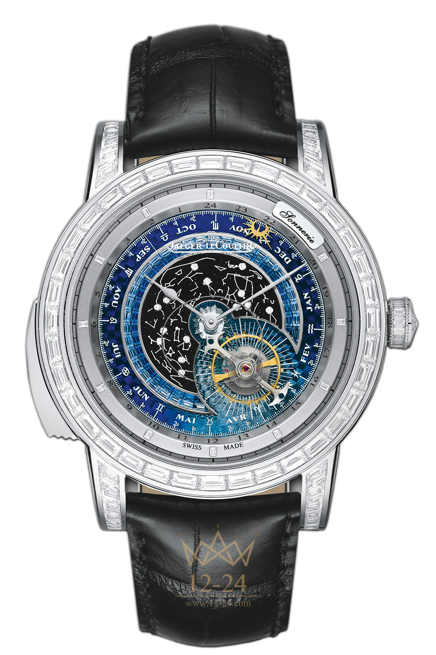 Master Grande Tradition Grande Complication. Корпус и циферблат обильно украшены бриллиантами, а циферблат представлен в сине-черной гамме. Классический дизайн, белое золото и украшения в виде деталей механизма в соответствии с высокими традициями часового искусства свидетельствуют о колоссальном объеме навыков и знаний, полученные за время существования часового Дома. Механизм с ручным подзаводом, калибр Jaeger-LeCoultre 945, ручная отделка, 527 деталей, 49 камней, частота колебаний 28800 пк/ч, запас хода 48 ч. Функции: часы, минуты, турбийон, небесная карта Северного полушария, минутный репетир Сathedral crystal, «Trebuchet» молоточки, годовой календарь (дата, месяц), знаки зодиака, 24-часовая индикация. Корпус из 18К белого золота, диаметром 46,7 мм, толщиной 15,92 мм. Циферблат авантюриновый с голубыми багетными сапфирами. Сапфировое стекло. Водонепроницаемость до 50 м. Ремешок из кожи аллигатора.
